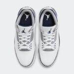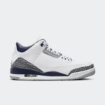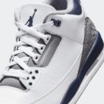 Buty Air Jordan 3 Midnight Navy charakteryzują się elegancką kolorystyką, która łączy w sobie granatowe, białe i szare akcenty. Główna cholewka w odcieniu głębokiego midnight navy nadaje im nowoczesny i stylowy wygląd. Białe elementy, takie jak podeszwa oraz logo, kontrastują z ciemnym kolorem, nadając butom świeżości. Szare detale, w tym skórzane wykończenia, dopełniają całości, tworząc harmonijną i luksusową estetykę. Idealne dla osób ceniących sobie zarówno sportowy styl, jak i elegancję.