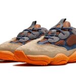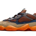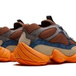 Adidas Yeezy 500 Enflame charakteryzuje się dynamiczną kolorystyką, która wprowadza energię i nowoczesność do klasycznego modelu. Główna paleta kolorów obejmuje intensywny odcień pomarańczowego, który dominującym akcentem, harmonijnie współgra z odcieniami brązu i beżu. Dodatkowo, w konstrukcji zastosowano elementy w ciemniejszym odcieniu szarości, co nadaje całości głębi i tekstury. Materiały o zróżnicowanej fakturze, takie jak siateczka, skóra oraz zamsz, podkreślają nowoczesny styl i charakter butów. Całość tworzy odważny, ale zarazem elegancki look, idealny na codzienne stylizacje.