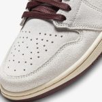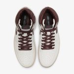 Buty Air Jordan 1 High A Ma Maniere wyróżniają się elegancką, stonowaną kolorystyką. Główna cholewka utrzymana jest w odcieniu burgundowym, który nadaje im klasyczny i luksusowy wygląd. Dodatkowo, zastosowane akcenty w kolorze beżowym i kremowym subtelnie kontrastują z ciemniejszymi elementami, nadając całości wyrafinowanego charakteru. Detale w kolorze zgaszonego złota oraz unikalne tekstury skóry podkreślają wyjątkowość tego modelu, idealnie łącząc styl streetwearowy z elegancją.