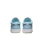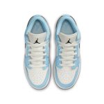 Air Jordan 1 Low Ice Blue Black to model, który łączy w sobie elegancję i sportowy styl. Cholewka buta przyciąga wzrok jasnoniebieskim kolorem przypominającym lód, który nadaje świeżości. Czarne akcenty, umieszczone na logotypie oraz w okolicach pięty, kontrastują z jasnym odcieniem, dodając mu mocy i wyrazistości. Całość dopełnia biała podeszwa, która podkreśla nowoczesny charakter tego modelu. Idealne dla osób szukających modnego obuwia, które wyróżnia się na tle innych.