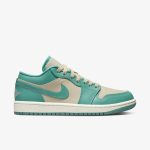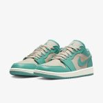 Buty Air Jordan 1 Low Tropical Teal charakteryzują się świeżą i żywą kolorystyką. Główna cholewka w odcieniu tropikalnej zieleni (teal) łączy się z białymi akcentami, które pojawiają się na podeszwie, języku oraz logo. Dodatkowo, czarne detale dodają kontrastu i elegancji. Całość tworzy harmonijną i energetyczną kompozycję, idealną na cieplejsze dni.