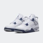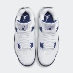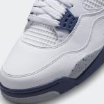 Air Jordan 4 Midnight Navy to model, który łączy elegancję z nowoczesnym stylem. Buty te charakteryzują się dominującą ciemnoniebieską kolorystyką, która nadaje im klasyczny wygląd. Białe akcenty, umiejscowione na podeszewce, otoku i skrzydłach, kontrastują z głębokim niebieskim kolorem, tworząc harmonijną całość. Dodatkowe elementy w kolorze szarym podkreślają sportowy charakter butów. Całość sprawia, że Air Jordan 4 Retro „Midnight Navy” to idealny wybór zarówno na co dzień, jak i do bardziej eleganckich stylizacji.